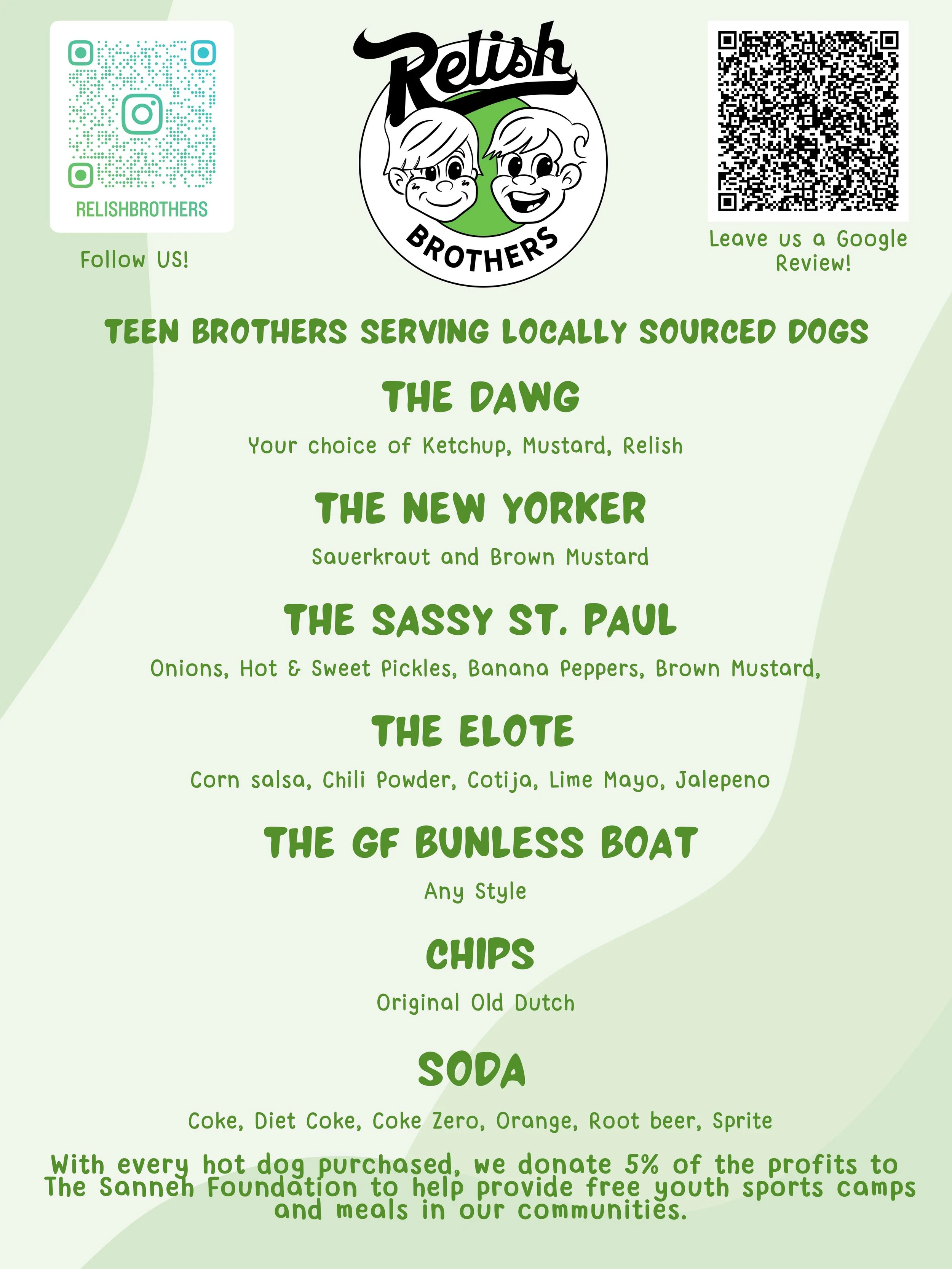 Relish Brothers ™ is a teen-owned business based in St. Paul, Minnesota. We are dedicated to serving delicious, locally sourced hot dogs with a purpose.